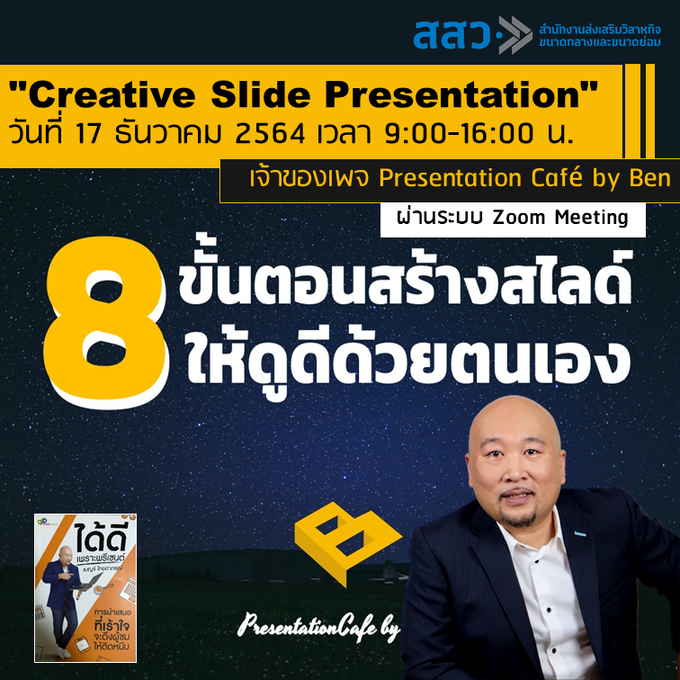 ฝทบ. ได้จัดการอบรม "Creative Slide For Presentation" ในวันที่ 17 ธันวาคม 2564 เวลา 9:00-16:00 น. ผ่านระบบ Zoom meeting ซึ่งมีผู้เข้าร่วมอบรมทั้งสิ้น 32 คน ทั้งนี้ ท่านสามารถ download เอกสารประกอบการบรรยายได้ตามไฟล์ที่แนบมานี้