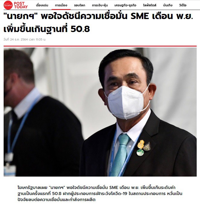 โฆษกรัฐบาลเผย "นายกฯ" พอใจดัชนีความเชื่อมั่น SME เดือน พ.ย. เพิ่มขึ้นเกินระดับค่าฐานเป็นครั้งแรกที่ 50.8 ฝากผู้ประกอบการเฝ้าระวังโควิด-19 ในสถานประกอบการ หวั่นเป็นปัจจัยลบต่อความเชื่อมั่นและกำลังการผลิต