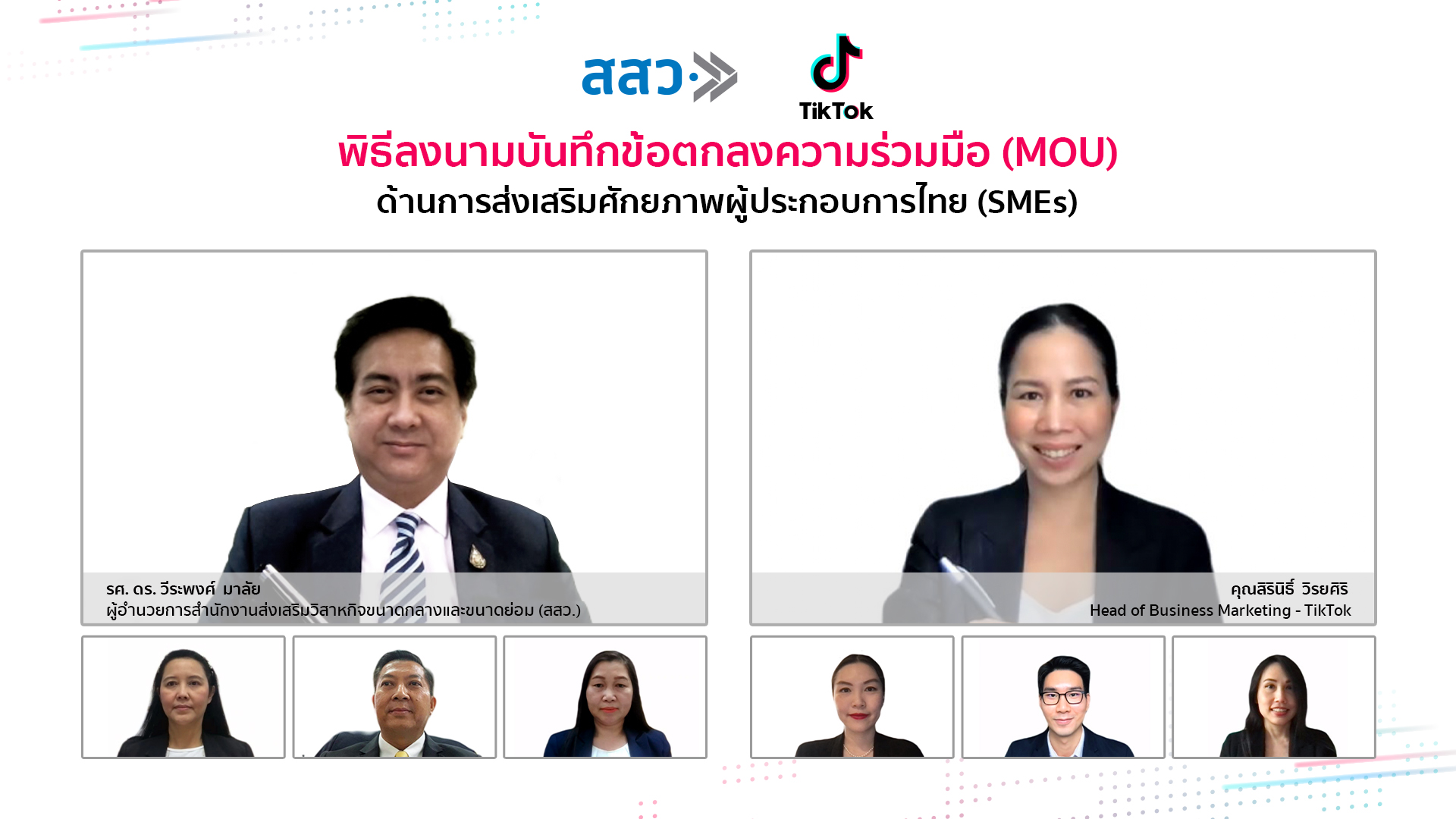 TikTok ร่วมมือกับ สสว. เดินหน้าติดอาวุธ SME ไทย พร้อมเพิ่มขีดความสามารถในการแข่งขันให้สามารถสร้างการเติบโตให้กับธุรกิจได้อย่างยั่งยืนในยุคเศรษฐกิจดิจิทัล ผ่านพิธีลงนามบันทึกข้อตกลงความร่วมมือ (MOU) เพื่อเปิดโอกาสให้ธุรกิจ SME ได้พัฒนาความรู้ความเข้าใจในการใช้แพลตฟอร์มดิจิทัลเพื่อสร้างรูปแบบการทำการตลาดและโฆษณาให้เกิดประสิทธิภาพสูงสุด