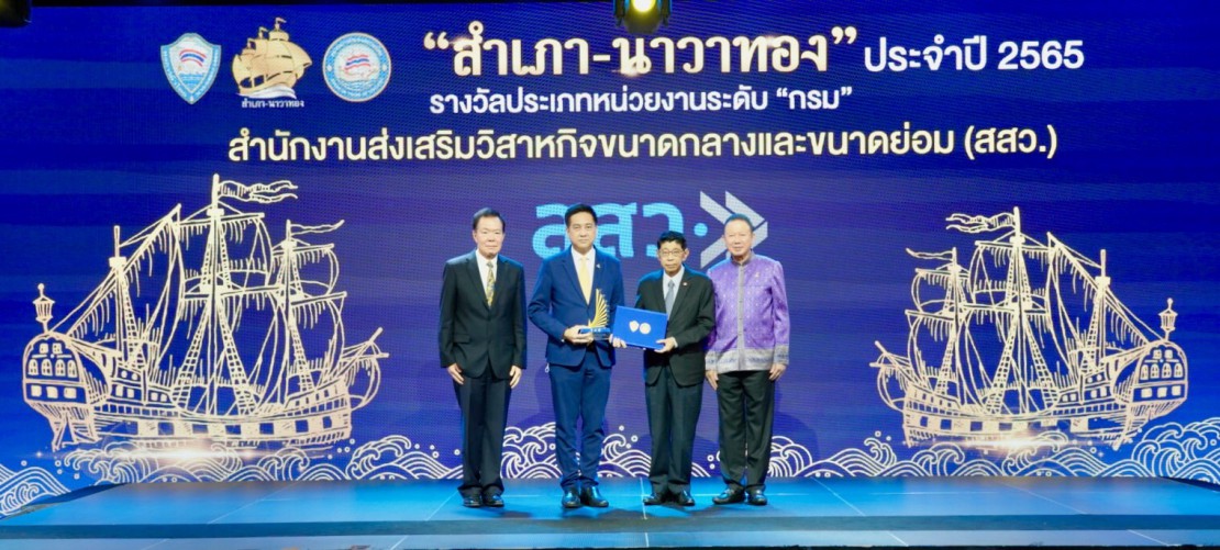 รางวัลสำเภา-นาวาทอง เป็นรางวัลที่หอการค้าไทย และสภาหอการค้าแห่งประเทศไทย มอบกับหน่วยงานภาครัฐ ด้านการอำนวยความสะดวกภาคธุรกิจ หน่วยงานภาครัฐได้ดำเนินการปลดล็อกกฎหมาย กฎระเบียบ (Regulatory Guillotine) เพื่อช่วยลดปัญหาอุปสรรคและอำนวยความสะดวกในการดำเนินธุรกิจ โดยในปีนี้ สสว. เป็นหน่วยงานที่ได้รับรางวัลในระดับกรม โดยพิธีมอบรางวัลดังกล่าว จัดขึ้น ณ หอประชุมชั้น 7 อาคาร 24 ม.หอการค้าไทย วันนี้ (14 ธ.ค. 2565)