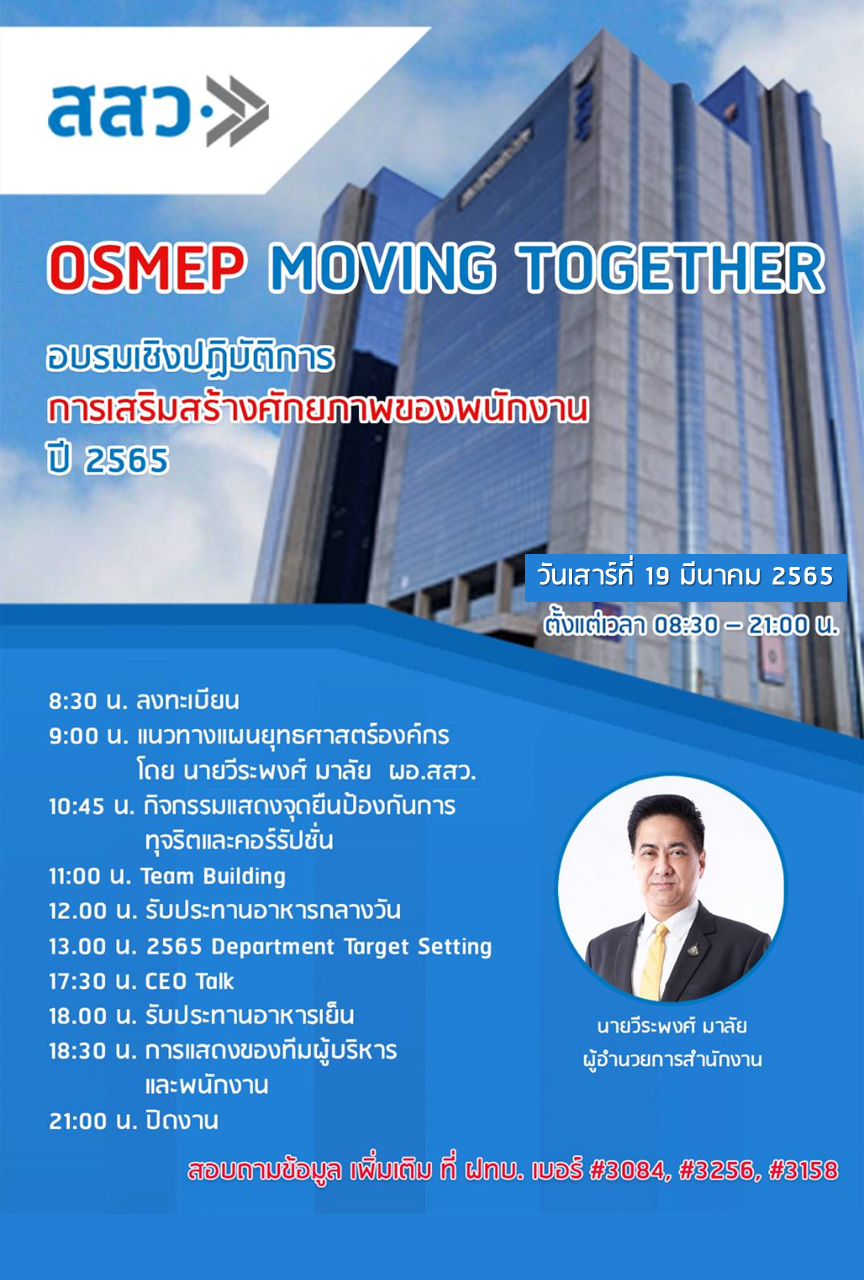 #จึงขอเลื่อนการจัดอบรมเชิงปฏิบัติการ "การเสริมสร้างศักยภาพของพนักงาน (OSMEP MOVING TOGETHER)" ปี 2565 เป็นวันเสาร์ที่ 19 มีนาคม 2565