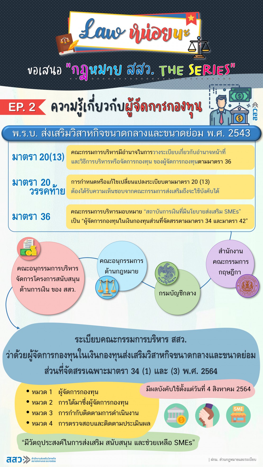 สวัสดีคร้าบบบ พบกับ “LAW หน่อยนะ” by ส่วนกฎหมายและระเบียบ กันอีกแล้วนะครับ เรายังอยู่ในจักรวาล “กฎหมาย สสว. The Series” วันนี้ ขอเสนอ “EP.2 ความรู้เกี่ยวกับผู้จัดการกองทุน”