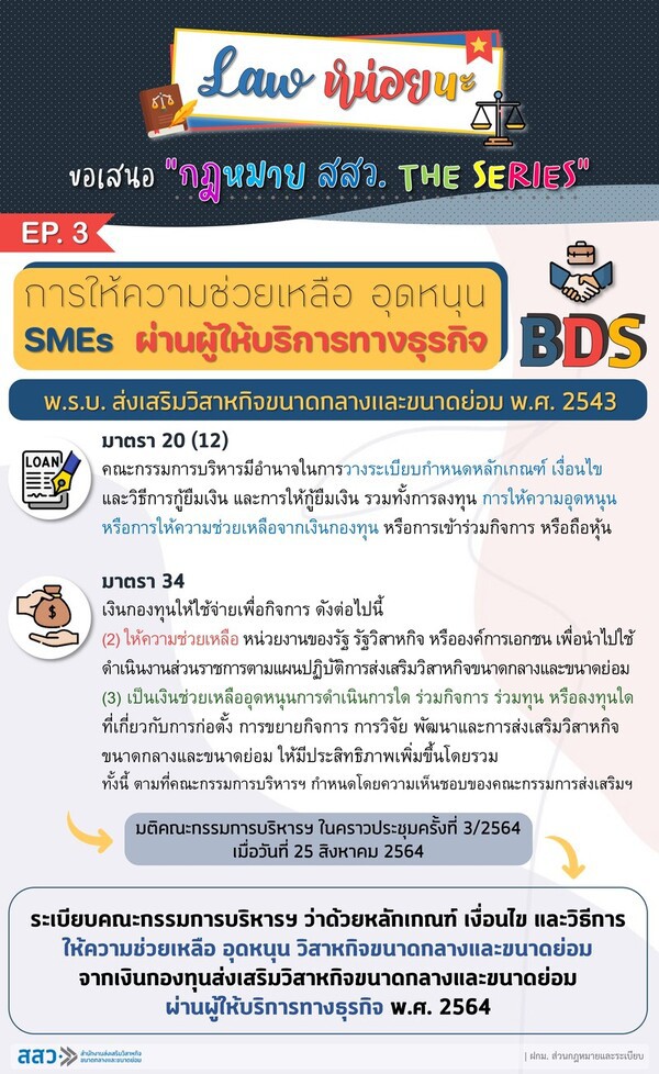 จบกันไปแล้วนะครับสำหรับคอลัมน์ ..กฎหมาย สสว. The Series.. EP.3 "การให้ความช่วยเหลือ อุดหนุน SMEs ผ่านผู้ให้บริการทางธุรกิจ (BDS)" หวังว่าบทความนี้จะเป็นประโยชน์กับ ชาว สสว. นะครับ