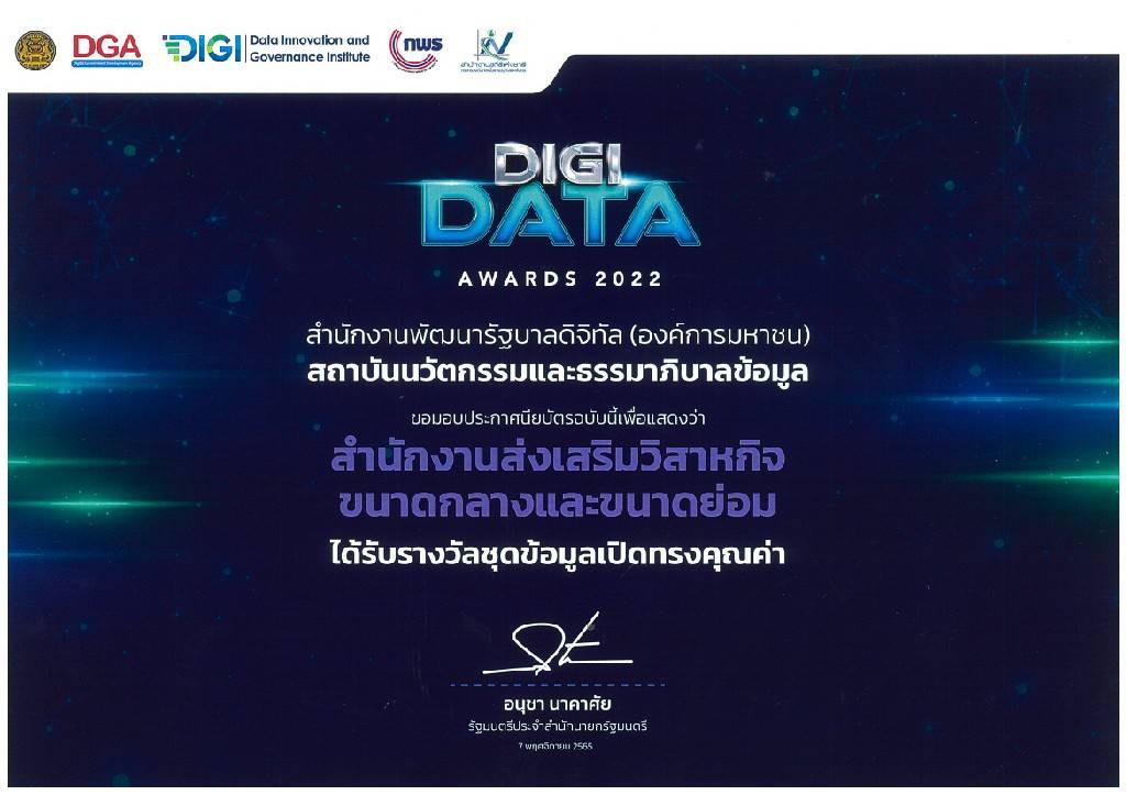 สำนักงานส่งเสริมวิสาหกิจขนาดกลางและขนาดย่อม (สสว.) ได้รับรางวัล การเผยแพร่ข้อมูลเปิดยอดเยี่ยมแห่งปี “โครงการ DIGI DATA AWARDS 2022